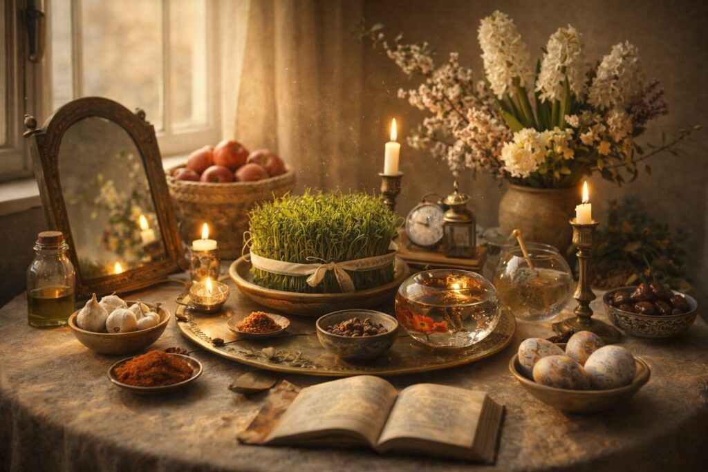 - Nowruz (Perse) : Célébré depuis plus de 3000 ans, le « Nouveau Jour » marque la minute exacte de l’équinoxe astronomique. Les familles y dressent le Haft-seen, une table rituelle rassemblant sept éléments précis (jeunes pousses de blé, pommes, épices, jacinthes…). Ce n’est pas qu’un repas : c’est un autel domestique qui célèbre la victoire éclatante de la vie sur l’immobilité de l’hiver.